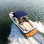 Plancher entièrement en teck, baille à mouillage avant, planches de couverture arrière, repose-pieds de barre et plateforme de bain